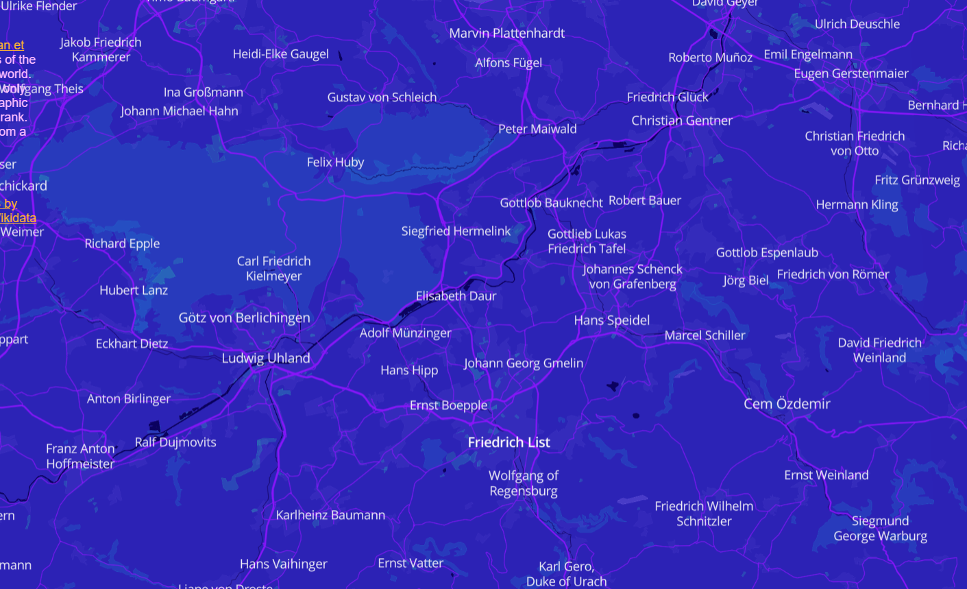 Karte, aber anstelle mit Ortsnamen, die Namen der berühmten Söhne und Töchter dieser Stadt. Gerade gelernt: Götz von Berlichingen wurde in Tübingen geboren.